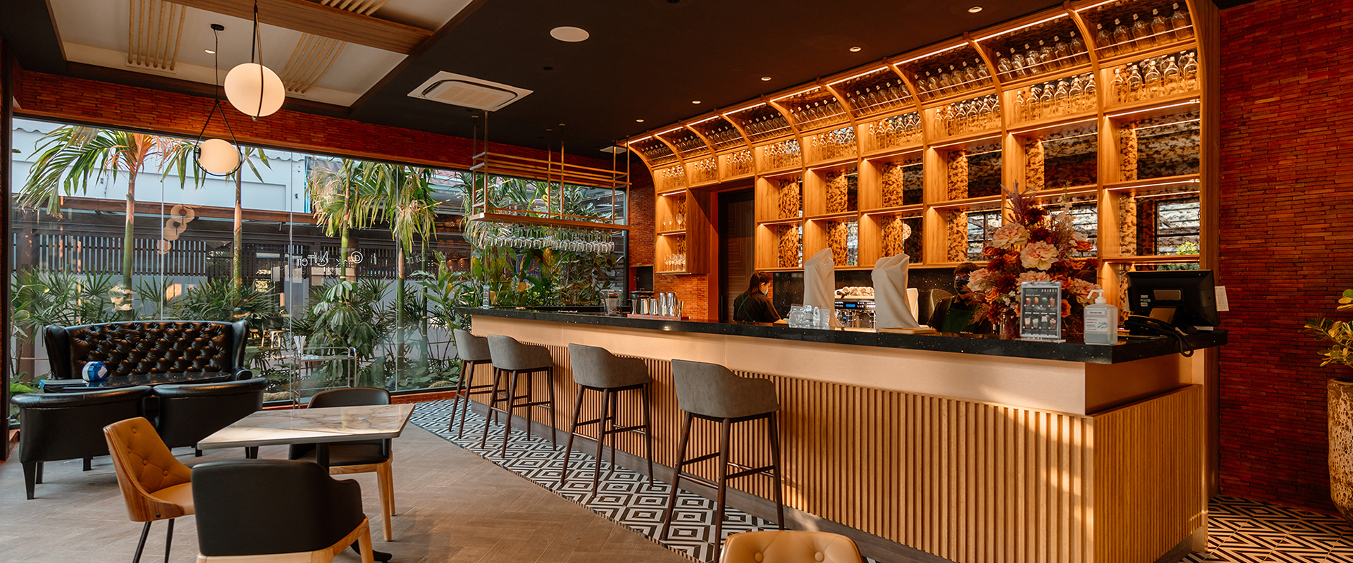 The featured terrace bar is the highlight of this renovation. Opened as a coffee bar serving premium coffee and supporting working people from small to medium groups who like to work at coffee shops, meetings and co-working spaces, this glass house style terrace bar is also equipped with fine and stylish furniture in a high ceiling setting that provides the chilling atmosphere. Serving various lunch sets and homemade cakes during daytime and turning into a bar area in the evening, this new hangout spot is also serving great classic and modern cocktails by skilled bartenders featuring wine cellar and various local beers.