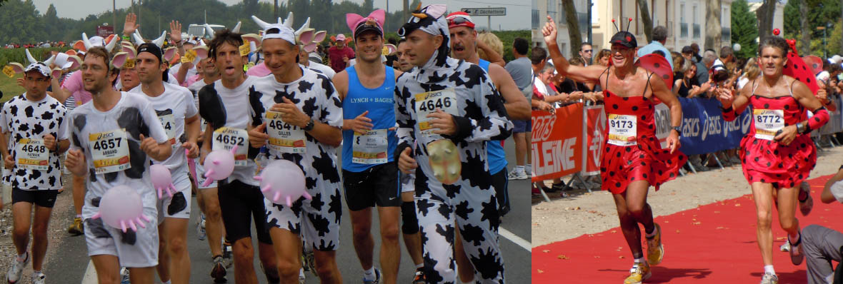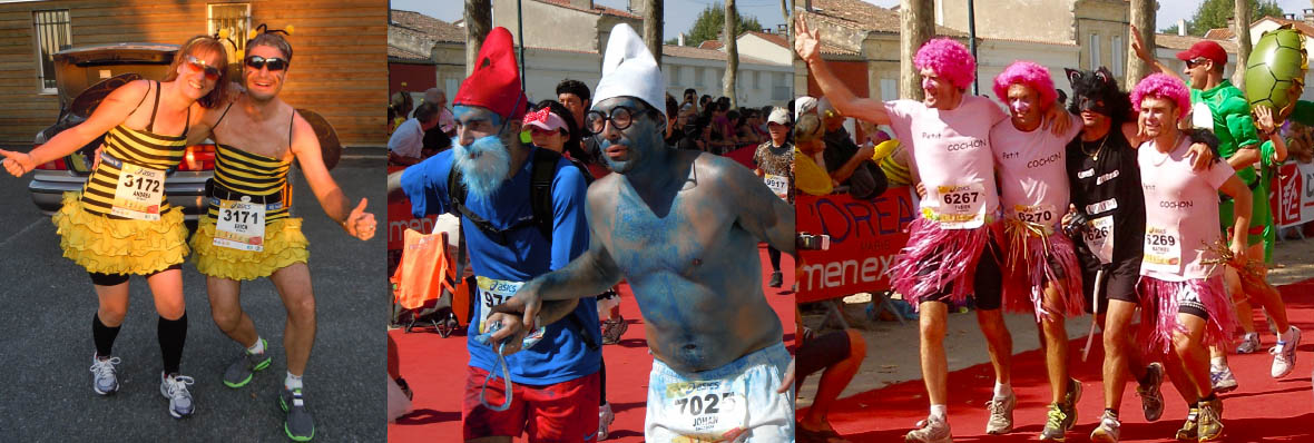 The marathon starts and finishes in Pauillac a small town on the Gironde River midway between the city of Bordeaux and the Atlantic Ocean and winds through the villages which dot the vineyards of Bordeaux. Citizens move furniture outside to watch the costumed runners squeeze through narrow village streets before heading to the vineyards. Each stop on the route has food and music ranging from jazz to reggae, folk, rock and classical.