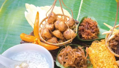 Among the well-known dishes that reflect Phetchaburi’s cultural roots are Kaeng Kua Hua Tan (toddy palm curry), Khanom Cheen Thotman (fermented rice-flour noodles with fried fish cake), Khao Chae (rice soaked in water accompanied by a variety of side dishes) and Kuaitiao Nam Daeng (red-soup noodles).